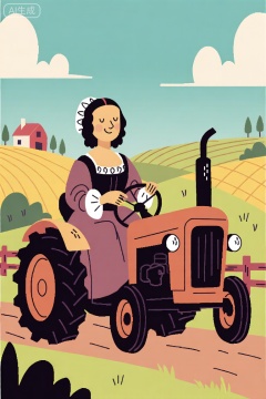 卡通插图,蒙娜丽莎在乡村环境中驾驶一辆老式拖拉机。她带着她标志性的神秘微笑和传统的文艺复兴服装。景观包括连绵起伏的丘陵、阳光明媚的田野和质朴的农场元素。这一场景捕捉到了历史优雅和现代农业生活的超现实融合,柔和的阳光投射出柔和的阴影。