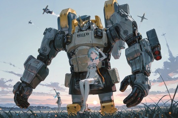 8k,best quality,masterpiece,(ultra-detailed),(high detailed skin),(artist:reoen:0.826446),(artist:machi:0.9),(artist:ningen_mame:0.9),(artist:sho_(sho_lwlw):0.9),(artist:rhasta:0.9),(artist:wlop:0.7),(artist:ke-ta:0.6),(fkey:0.5),(tianliang duohe fangdongye:0.5),(hiten \(hitenkei\):0.6),best quality,amazing quality,(artist:onineko:0.826446),very aesthetic,bokeh,Epic scene,full shot of a young girl with flowing hair,sitting on the head of a towering,weathered giant robot. She gazes contemplatively into the vast,fading sunset horizon. The robot's hand gently steadies her,while the other arm is posed as if resting. They are positioned on a high vantage point overlooking a serene,expansive grassland,hints of a past battlefield visible in the distance. The sky is painted with the warm,soft colors of dusk,with a prominent vanishing point drawing the eye to the horizon. Dynamic camera angle,cinematic lighting,<lora:seedjql-ill-Tanger:0.8>,1girl and 1robot,seed's robot,seed \(Zenless Zone Zero\),clothes: seedef grey dress,1girl,blue hair,seedef elbow gloves,breasts,arm up,grey gloves,short hair,missile launcher,weapon,height difference,