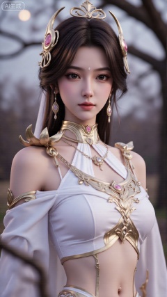 1girl, branch, solo, long hair, jewelry, earrings, hair ornament, dress, flower, looking at viewer, upper body, bare shoulders, chinese clothes, black hair, brown hair, white dress, hair bun, off shoulder, moon, closed mouth, expressionless, long sleeves, makeup