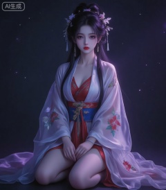 1girl, solo, looking at viewer, black hair, hair ornament, flower,parted lips, japanese clothes, hair flower, kimono,red lips,  realistic,embroidered kimono,kneeling,night,purple light