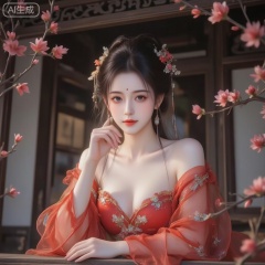 Ancient beauty, plump breasts, front, costumed red tulle outfit, flower embroidery, off-shoulder, headdress, jewelry, sweet smile, disheveled hair, messy hair, clear and slightly drunk makeup, smooth and delicate skin. A slim figure and a charming face that charms all living beings,