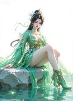 What makes her look even more unique is the shoes on her feet. The green high-heeled boots are embroidered with gilded patterns, and the golden thread winds along the boot barrel, shining with fine light against the pure white background. She crossed her legs, raised her heels lightly, revealing the delicate golden patterns on the side of the boots, and her fair ankles complemented the green boot surface and gilded patterns, which were both classical and elegant, and also had a bit of cute and agile. In the phantom of the water, her clothes, hairpin and golden boots were intertwined, but she could not cover the vivid green green - in this pure world, she was the most eye-catching scenery.