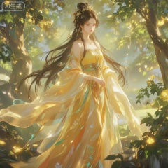 She is wearing a very beautiful yellow long dress with exquisite embroidery and floral patterns on it,which makes her look very noble and elegant. The dress is beautifully designed,fits the body shape,and shows the beautiful curves. The whole picture is full of a dreamy atmosphere,as if you are in a fairy tale world,