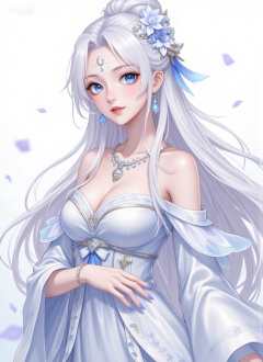 1girl, solo, long hair, breasts, blue eyes, hair ornament, dress, cleavage, bare shoulders, jewelry, medium breasts, flower, white hair, earrings, hair flower, wide sleeves, necklace, off shoulder, lips, facial mark, crescent, forehead mark