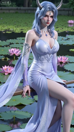 (masterpiece, best quality:1.2),1girl,long hair,flower,blue hair,lily pad,solo,dress,red eyes,sitting,breasts,horns,bare shoulders,lotus,blue dress,water,looking at viewer,medium breasts,pointy ears,detached sleeves,collarbone,cleavage,pink flower,monster girl,,(huge breasts:2.99),(full breasts:2.99),,XbaifengsongyuYH,Xbigbreasts,Xyehuiling,XtangwutongXnb,Xyinyangjiaoshengnv,XmupeilingHongyi,XsiyouyouYH,XkejinnvdiHY,Xbaitianshi,XtangwutongXM,XnvgongjueNB