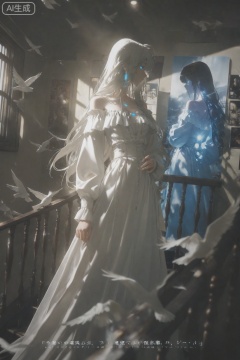 1girl,dress,long hair,solo,white dress,off-shoulder dress,window,indoors,bare shoulders,bird,off shoulder,long sleeves,profile,blurry,standing,blurry foreground,depth of field,bangs,day,stairs, extreme aesthetic,(quasarcake:0.7),masterpiece,best quality,good quality,newest,year 2024,year 2023,very aesthetic,absurdres, A shot with tension,(Visual impact,giving the poster a dynamic and visually striking appearance:1.2),impactful picture,offcial art,colorful,splash of color,movie perspective,advertising style,magazine cover, insanely interplay between lights and shadows,(ray tracing),sunlight,reflective,masterful details,intricate details,soothing tones,high contrast,natural skin texture,soft light,sharp, ultra-high resolution,32K UHD,sharp focus,best-quality,masterpiece,Emotionalization,unconventional supreme masterpiece,masterful details,temperate atmosphere,with a high-end texture,in the style of fashion photography, (glowing:1.2),depth of field,blurry background,cast shadow,black theme,dutch angle,photo background,3d background,hyperrealism background,