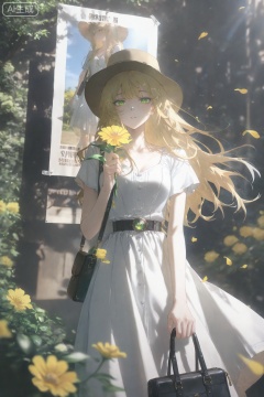 1girl,solo,long hair,green eyes,dress,outdoors,holding,white dress,hat,blonde hair,short sleeves,looking at viewer,bag,bangs,day,flower,belt,brown headwear,petals,blurry,standing,holding bag,blurry foreground,closed mouth,handbag,parted lips,yellow flower,tree, extreme aesthetic,(quasarcake:0.7),masterpiece,best quality,good quality,newest,year 2024,year 2023,very aesthetic,absurdres, A shot with tension,(Visual impact,giving the poster a dynamic and visually striking appearance:1.2),impactful picture,offcial art,colorful,splash of color,movie perspective, insanely interplay between lights and shadows,(ray tracing),sunlight,reflective,masterful details,intricate details,soothing tones,high contrast,natural skin texture,soft light,sharp, ultra-high resolution,32K UHD,sharp focus,best-quality,masterpiece,Emotionalization,unconventional supreme masterpiece,masterful details,temperate atmosphere,with a high-end texture,in the style of fashion photography, (glowing:1.2),depth of field,blurry background,cast shadow,black theme