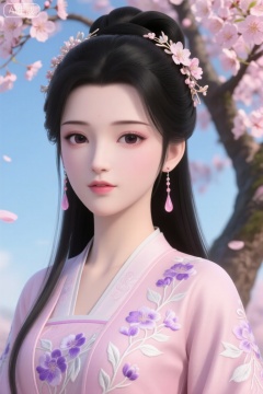 3D游戏角色,古风女子,乌黑长发,精致发髻,头戴花朵发饰,粉色花瓣、小花点缀,耳饰为粉色水滴形,身着粉色汉服,衣上有紫色花朵、白色枝叶刺绣,背景是开满粉色花的树、蓝天,清新,唯美,古典,春日氛围,