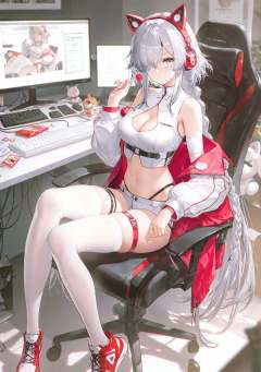 highres,extremely detailed 8k wallpaper,illustration,depth of field,great quality,masterpiece,best quality,amazing quality,very aesthetic,absurdres,detail eyes,(artist:ran'ou_(tamago_no_kimi):0.5),(artist:atdan:0.5),artist:yolanda,artist:rella,(artist:vixen),year 2023 BREAK<lora:nai4 shiny style 2:0.7>,nai4 shiny style, -1girl, solo, breasts, long hair, thighhighs, food, headphones, micro shorts, sitting, chair, candy, navel, looking at viewer, bare shoulders, shorts, crop top, monitor, braid, fake animal ears, lollipop, holding, white thighhighs, off shoulder, bandages, jacket, cleavage, short shorts, red footwear, keyboard (computer), stomach, animal ears, thighs, midriff, thigh strap, very long hair, grey hair, white shorts, office chair, long sleeves, shirt, sleeveless shirt, white shirt, blood, medium breasts, open jacket, animal ear headphones, hair over one eye, shoes, sleeveless, grey eyes, chromatic aberration, skindentation, stuffed toy, indoors, holding candy, open clothes, closed mouth, eyepatch, bandaged arm, holding food