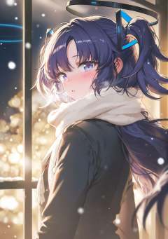 highres,extremely detailed 8k wallpaper,illustration,depth of field,great quality,masterpiece,best quality,amazing quality,very aesthetic,absurdres,detail eyes,rim light,Volumetric Lighting,backlighting,(artist:tokkyu:0.7),(artist:tokkyu:yoneyama_mai:0.5),(artist:ran'ou_(tamago_no_kimi):0.5),(artist:atdan:0.5),artist:yolanda,artist:rella,(artist:vixen),year 2023 BREAKnai4 shiny style,<lora:nai4 shiny style V2:1>, -1girl, halo, solo, yuuka (blue archive), scarf, long hair, looking at viewer, breath, window, two side up, bangs, night, purple hair, snowing, upper body, looking back, purple eyes, jacket, blue eyes, blurry, blush, black jacket, parted lips