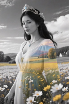 aidmafluxpro1.1. Midjourney, Midjourney style, realism, cinematic quality, Double exposure illustration of a goddess silhouette integrated with a spring field, goddess details blended into the backdrop, monochrome background in sharp focus, full color, crisp lines inspired by Jean Baptiste Monge, Thomas Kinkade, David Palumbo, Carne Griffiths, CG graphics, high quality, 8K Ultra HD, vivid colors, cinematic