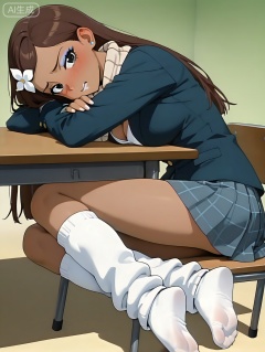 incredibly absurdres,best quality,amazing quality,masterpiece,extremely detailed,skin texture,detailed skin,detailed hair,1girl,A,solo,dark skin,skirt,scarf,loose socks,makeup,blue eye shadow,white lipstick,hair flower,brown hair,long hair,black eyes,school uniform,beautiful,anime screencap,full body,cleavage,looking at viewer,foot texture,soles,shy,Leaning on the table,from behind,