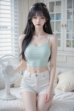 Masterpiece, highest quality, high quality, small breasts, (black hair: 1.4), (long legs: 1.3, (thin legs: 1.4),The image shows a young woman with long dark hair, wearing a light green crop top and white shorts. She is standing next to a white fan placed on a white couch. The background includes a window with white blinds and a white cabinet with glass doors. The setting appears to be a bright, well-lit room, possibly a bedroom or living area.Canon EOS R5 with a 50mm f/1.8 lens. Set aperture to f/4 - f/8, shutter speed to 1/100s - 1/200s, and ISO to 100 - 400.