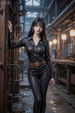 The subject is a young woman of Taiwanese descent, with a pale complexion and a slender figure. She is dressed in a fitted black leather jacket with a rust-colored belt, paired with dark jeans and knee-high boots. Her facial features are sharply defined, with a subtle hint of makeup that emphasizes her natural beauty. The lighting is dramatic, casting long shadows that accentuate the texture of her skin and the metallic details of her clothing.