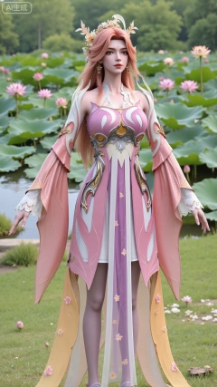 (masterpiece, best quality:1.2),1girl, navel, solo, midriff, bare shoulders, hair ornament,(long hair), red lips, BREAK, (looking at viewer:1.39), chinese clothes,(Holographic Color long dress:1.36), (lace,Rainbow Gradient Color:1.28), BREAK,blurry, solo focus, long hair, lips, daytime, lipstick, outdoors, standing,upper body,(huge breasts:2.89), background, solo, makeup,(Stockings, high heels:1.29),(huge breasts:2.99),(full breasts:2.99),,(Background with lotus pond and lotus flowers:1.39),,,XbaifengsongyuYH,Xbigbreasts,Xyehuiling,XtangwutongXnb,Xyinyangjiaoshengnv,XmupeilingHongyi,XsiyouyouYH,XkejinnvdiHY,Xbaitianshi,XtangwutongXM,XnvgongjueNB,XchuyueXM,Xtantaizhangmen,XhuangjinhuanvziNB