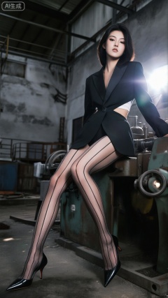 主体是穿着解构主义黑色西装套装,内搭白色露腰短上衣,搭配黑色条纹丝袜和12 厘米黑色漆皮金属尖头高跟鞋的模特,随性地坐在废弃工厂的旧机器上。风格融合了时尚与叛逆,彰显独特个性。光线使用冷色的工业探照灯,从侧后方强烈打光,在模特身上形成强烈的明暗对比,强化立体效果。渲染注重突出西装的解构设计细节、短上衣的轻薄质感以及丝袜的弹性。色彩以黑白为主,黑色为主调展现酷帅,白色作为点缀增加层次感。构图采用非对称构图,模特与旧机器组合形成不规则形状,位于画面右侧,左侧留出部分空间,营造出动态与张力。从低角度近拍仰角拍摄,突出模特的高挑身材与不羁气质。以高分辨率、清晰锐利的画质,生成极具个性的时尚大片写真。