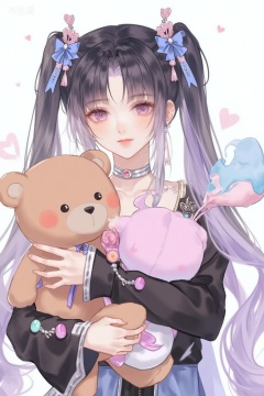 1girl,stuffed toy,stuffed animal,solo,teddy bear,twintails,pink eyes,bangs,bow,white background,collar,jewelry,ribbon,looking at viewer,long hair,multicolored hair,purple hair,earrings,heart,food,simple background,upper body,black hair,ear piercing,long sleeves,hair bow,holding stuffed toy,closed mouth,holding,piercing,hair ribbon,candy,hair ornament,blunt bangs,blue bow,dress,gradient hair,blue ribbon,object hug,shirt,braid,collarbone,black shirt,
