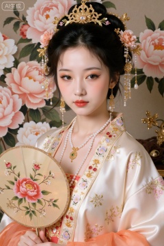 Realistic photo of a young woman with bun, fair skin, big breasts, golden headdress, golden earrings, peony embroidery, patterned silk Chinese style Hanfu, pearl necklace, peony flower fan, exquisite makeup, upper body, peony painting background,