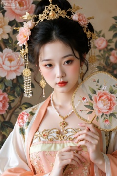 Realistic photo of a young woman with bun, fair skin, big breasts, golden headdress, golden earrings, peony embroidery, patterned silk Chinese style Hanfu, pearl necklace, peony flower fan, exquisite makeup, upper body, peony painting background,