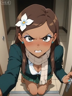 incredibly absurdres,best quality,amazing quality,masterpiece,extremely detailed,skin texture,detailed skin,detailed hair,1girl,A,solo,dark skin,green skirt,scarf,earings,makeup,blue eye shadow,white lipstick,hair flower,brown hair,long hair,black eyes,school uniform,nail_polish,beautiful,anime screencap,full body,cleavage,looking at viewer,gold anklet,barefoot,foot texture,tsundere,gritting teeth,kick the door