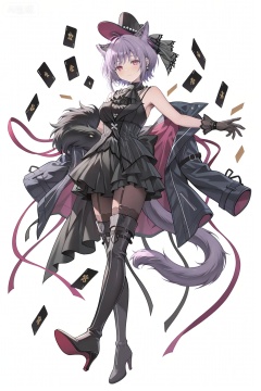 looking at viewer,,Yuutenji Nyamu,short hair,purple eyes,red eyes,bangs,purple hair,breasts,skirt,thighhighs,gloves,hat,animal ears,jacket,tail,pantyhose,boots,sleeveless,black gloves,black footwear,high heels,black headwear,thigh boots,garter straps,top hat,card