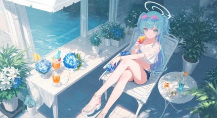 1girl, solo, breasts, looking at viewer, smile, bangs, blue eyes, shirt, navel, holding, jewelry, sitting, closed mouth, blue hair, collarbone, swimsuit, full body, flower, short sleeves, food, shorts, water, nail polish, cup, see-through, short shorts, bare legs, fruit, watermark, chair, sandals, table, sunglasses, crossed legs, plant, white flower, holding cup, eyewear on head, drinking glass, blue nails, toenails, blue flower, blue theme, bouquet, ice cream, toenail polish, glass, potted plant, transparent, tinted eyewear, holding bouquet, vase