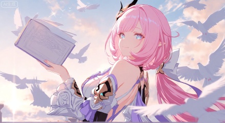 1girl, solo, looking at viewer, smile, bangs, blue eyes, hair ornament, long sleeves, holding, bare shoulders, closed mouth, pink hair, outdoors, sky, pointy ears, looking back, cloud, book, bird, cloudy sky, holding book, dove, elysia \(honkai impact\)