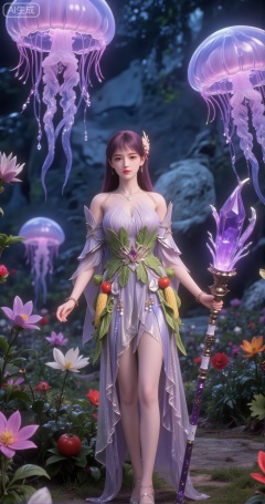 Additionally, there is a staff with a glowing purple crystal in her hand, enhancing the magical and mystical feel of the scene
