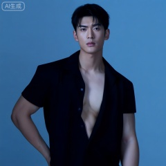 Medium shot, front view of an Asian man. He has short dark hair and wears an open black short - sleeved shirt, showing toned chest and abs. Standing with one arm extended to the side, looking directly at the camera with a serious and intense expression. Cool - toned, soft ambient lighting with blue hue, photorealistic, high detail.