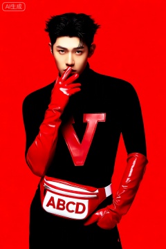 一张时尚前卫风格的男性摄影,平视视角,构图简洁,背景为纯红色,色彩鲜明饱和。模特侧身站立,头部微转向镜头,一只手靠近嘴部,姿态自然且时尚。内搭黑色高领衫,胸前有大号“V”字标志,佩戴红色长手套,腰间系有红白两色腰包(印有“ABCD”字样),细节凸显现代感与品牌辨识度。灯光均匀明亮,清晰照亮人物与配饰细节,无阴影干扰。表情专注,传递出自信或投入的情绪。整体着装现代感强,色彩对比强烈,营造出时尚前卫的氛围,适合表达潮流、个性或品牌主题,