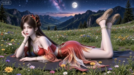 Lush green grass, wildflowers, night, mountain ranges, the Milky Way, the moon, beautiful and magnificent landscape. Ultra-clear, high resolution, realistic texture, high detail.,3d_character_hle