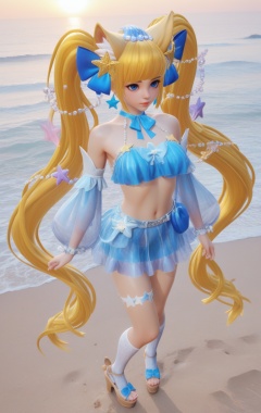 supermodel,score_8_up,score_7_up,hyperdetailed,hyperrealistic,volumetric lighting,focus on face,textured skin,eye lighting,SkinHairDetail,zPDXL,very attractive,Expressiveh,realistic skin,score_9,score_8_up,score_9,score_8_up,1 girls,high cold face,yujie,perfect round large,breasts,jewelry,beautiful eyes,detailed eyes,breast,lips,long hair,navel,jewelry,earrings,long hair,drop_shadow,light rays,sunlight,at the seaside,beach,sea water,<lora:1GM:0.8>,animal ears,bare shoulders,blonde hair,blue eyes,blue skirt,bow,breasts,closed mouth,detached sleeves,hair ornament,high heels,kneehighs,long hair,platform footwear,see-through,skirt,socks,star \(symbol\),twintails,very long hair,white socks,