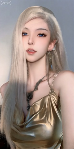 a photo-realistic portrait of a young woman with long, straight, platinum blonde hair and striking blue eyes, she is positioned in the middle of the image, wearing a gold, sleeveless dress with a plunging neckline that reveals her bare shoulders, the dress is adorned with a pearl necklace and earrings, adding a touch of elegance to her look, the woman has a neutral expression and is looking directly at the camera, with her lips slightly parted, the background is a simple, light-colored wall, which provides a subtle contrast to the womans elegant attire, the lighting is soft and even, highlighting her features and creating a serene atmosphere,