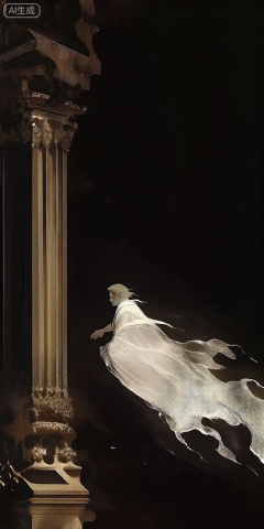a digital illustration shoot from below about a silhouette of a man in a flowing white robe against a dark background, with a tall, ornate column on the left, the image also shows a dramatic effect, with the figure appearing to be floating in the air, on the middle of the image, a man, who appears to be in his mid-twenties, is standing with his back to the viewer, facing away from the viewer, he is wearing a white, sheer robe that is flowing in the wind, creating a sense of movement and energy, the mans hair is styled in a short, neat manner, and he has a serious expression on his face, his body is slim, and his face is not visible, he has no clothing or accessories, the background is dark, and the lighting is dramatic, casting shadows and highlights on the figure,