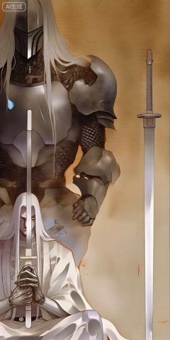 a digital illustration shoot from a front camera angle about a mysterious figure with long white hair holding a sword in front of a large, imposing figure behind them, the figure is seated in the middle of the image, wearing a white robe with intricate designs, and has a serious expression on their face, they are facing the viewer, and their hands are clasped together in a contemplative pose, behind the figure, a dark, armored figure with intricate details can be seen, partially obscured by the long, flowing white hair, the background is a simple, textured beige wall with a hint of orange, giving the image a sense of depth and atmosphere, on the right side of the figure stands a sword, adding to the sense of power and authority in the scene, the overall style is reminiscent of japanese anime and manga, with a focus on the intricate details of the armor and the figures design,