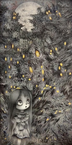 a whimsical and fantastical illustration featuring a small, chibi-style doll with a surprised expression, standing in the middle of the image, the doll has long, straight, black hair and large, expressive eyes that seem to be looking directly at the viewer, it is wearing a short, silver dress with a ruffled neckline, and the doll is positioned slightly to the left, giving a sense of depth and perspective, the background is a dark, starry night sky with a large, glowing moon in the center, surrounded by a dense, dark forest with glowing yellow spots, the overall style of the illustration is reminiscent of japanese manga or anime, with intricate details and a soft, ethereal quality,