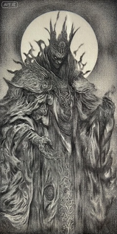 a black and white, detailed, and realistic illustration of a dark, ominous figure with a crown-like head and a long, flowing robe, the figure, positioned in the middle of the image, is facing the viewer with a stern, focused expression, the robe is intricately designed with a paisley pattern, and the figures hands are raised, giving a sense of power and authority, the background features a large, circular halo, adding to the ominous atmosphere of the scene, the style is reminiscent of dark fantasy art, with a focus on intricate details and shading, making the figure stand out from the background,