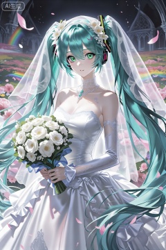 二次元,官方艺术、8k壁纸、Kiri、超细节、美丽、杰作、最佳品质、粉红色幻想主题彩虹风格哥特式独奏、白天、头上戴白色面纱的美丽女孩、婚纱,她穿着流行虚拟歌手Hatsune Miku的cosplay服装,她有长长的、明亮的绿松石色双马尾辫、绿色双马尾辫,绿色的眼睛,俯视着,白天,胸前放着一束白色的花,明亮、神秘、令人难忘、戏剧性、华丽、细节。充满活力,美丽,花田,细致。现代、细节丰富