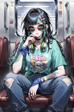 二次元,美学艺术,插图,图像的特点是一个具有明显女性特征的坐着的人的程式化数字插图。这个角色穿着一件印有“我们的”图案的休闲短袖绿松石t恤,还有一条有点破旧的牛仔裤。值得注意的是她左臂上可见的纹身和缠绕在右手腕上的蓝色头巾。她头上戴着超大的圆形太阳镜,脖子上戴着绿色的耳机。她的姿势很放松,有点沉思,一只手托着下巴,整体姿势显得随意自信。考虑到她身后有一个类似地铁的窗户,两边都有把手,背景似乎是一个公共交通空间。