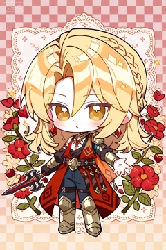 solo,, long hair,, looking at viewer,, blush,, bangs,, blonde hair,, long sleeves,, 1boy,, holding,, brown eyes,, jewelry,, standing,, full body,, yellow eyes,, weapon,, braid,, flower,, male focus,, earrings,, boots,, chibi,, holding weapon,, red flower,, armored boots,, checkered background,, Negative prompt: ng_deepnegative_v1_75t,(badhandv4:1.2),EasyNegative,(worst quality:2),username,out of focus,bad proportions,cropped,watermark,signature,worstquality,grayscale,logo,text,blurry,low quality,bad anatomy,sketches,lowres,normal quality,monochrome,,nsfw, Steps: 29, Sampler: Euler a, CFG scale: 7.0, Seed: 1053883112, Size: 1024x1536, Model hash: fe1361c879, Model: illustrious_v20_1.safetensors, Denoising strength: 0.0, RNG: CPU, Lora 1: Art-山楂糖, Lora Hash 1: 0b6112434b, Lora Weight 1: 0.8, vae_name: automatic