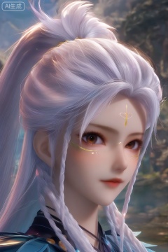 masterpiece, best quality, masterpiece,best quality,official art,extremely detailed CG unity 8k wallpaper,1girl,solo,looking at viewer,long hair,brown eyes,braid,white hair,facial mark,forehead mark,twin braids,ponytail,portrait