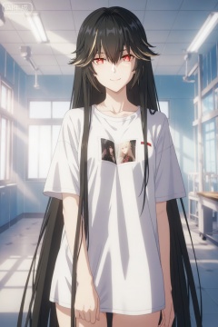 1girl, solo,lucia/punishing gray raven,blonde streaked hair, black hair,red eyes, hair between eyes,(very long hair,straight_hair:1.4),smooth anime-style texture,looking at viewer, soft sunlight through window, depth of field, cinematic lighting, anime style, detailed eyes reflection, soft shadows, hospital room interior, shallow focus,anime screencap,anime coloring,smile,front view,alternate costume,girlish,shirt,white shirt,cowboy shot