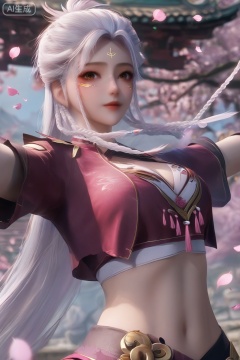 masterpiece, best quality, masterpiece,best quality,official art,extremely detailed CG unity 8k wallpaper,1girl,solo,looking at viewer,long hair,brown eyes,braid,white hair,facial mark,forehead mark,twin braids,body markings,faceoff,facing viewer,crop top,midriff,upper body,Cherry Blossoms,petals,breasts,cleavage,outstretched arms,