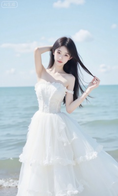 Gauze skirt,A young girl standing by the sea wearing a light white long dress, the sea breeze makes the skirt cling to her body, she uses her hand to brush back her hair in front of her face, her eyes are gentle and attractive, beautiful portrait, realistic lighting, ultra-high definition photography style.