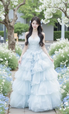 Gauze skirt,Air steps, steps covered with flowers, ethereal atmosphere, modern beauty, wearing a V-neck three-dimensional gauze dress, light blue flowing long dress, fluffy natural long hair, with blue small flowers, smiling walking on the steps, beautiful and dreamy, full view long shot of the whole body from the side,