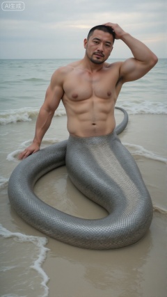 male snake,A serpent man: muscular shirtless human torso, reclining on a sandy beach where gentle waves lap at the shore, with his right arm resting on the sand and his left hand propping up his head; from belly button down, a thick silvery - scaled snake tail coils in a large curve on the sand, its tip extending toward the water; overcast sky with soft lighting; he has a relaxed expression.