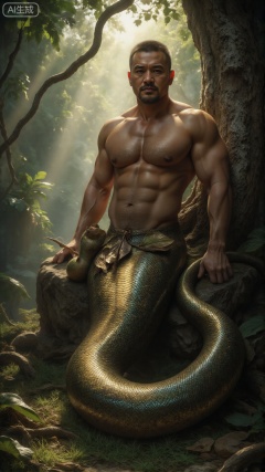 A close-up picture of a snake man leaning half on an old banyan tree by the cliff, realistic style. The upper body is in a strong human form, with clear muscle lines, dark brown and gold-shaped skin, with several dead leaves mixed between short hair; the lower body is a thick snake tail, the scales reflect an iridescent luster in the sun, a wild fruit hooked on the tip of the tail, and the tail body naturally turns into a spiral and falls on the grass. The background is a dense tropical rainforest, and the sunlight forms mottled spots through the branches and leaves, shining on him with light and darkness. The overall color is warm, highlighting the tension of the wildness and nature of the snake man. The details are clear enough to see the texture of the scales and the pores of the skin. The atmosphere of the picture is mysterious and full of vitality.