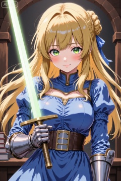 1girl,solo,long hair,breasts,looking at viewer,blush,smile,bangs,blonde hair,long sleeves,dress,ribbon,holding,hair between eyes,medium breasts,closed mouth,green eyes,hair ribbon,upper body,weapon,braid,sidelocks,puffy sleeves,sword,indoors,hair bun,holding weapon,armor,book,blue dress,holding sword,hair intakes,single hair bun,blue ribbon,juliet sleeves,shoulder armor,gauntlets,french braid,braided bun,book stack,glowing weapon,glowing sword,
