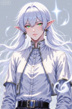 solo, long hair, looking at viewer, bangs, shirt, long sleeves, 1boy, twintails, jewelry, closed mouth, green eyes, white hair, male focus, earrings, pointy ears, striped, belt, parted bangs, sparkle, capelet, floating hair, elf, androgynous, black belt, glint, white capelet, floating object