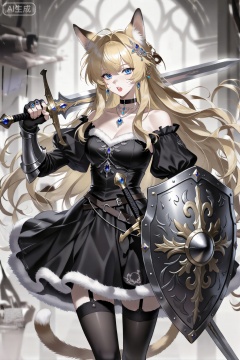 1女孩,独唱,长发,看着观众,刘海,蓝眼睛,金发,大腿,裙子,抱着,动物耳朵,**,两眼间的头发,裸露的肩膀,珠宝,中等胸部,站立,锁骨,武器,连裤袜,剑,黑色大腿,室内,项链,手持武器,盔甲,模糊,黑色连衣裙,嘴唇,毛皮镶边,模糊背景,脚出框,手持剑,戒指,宝石,盾牌,手持盾牌